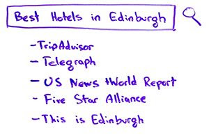 Let's say I'm a hotel operator in Edinburgh, and I run one individual hotel, maybe a boutique hotel, and I want to rank for "best hotels in Edinburgh." But that is nearly impossible, because if you look at the front page of results, all the folks there are comparative types of sites. They're media properties. They're hotel comparison shopping sites. So it's TripAdvisor and Telegraph and US News & World Report, and This is Edinburgh, which is a media magazine there.
